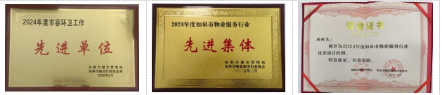 集团皋环清洁服务公司获“2024年度市容环卫工作先进单位”、产城服务公司获“2024年度物业服务行业先进集体”、顾树炎获“2024年度物业行业优秀项目经理”。